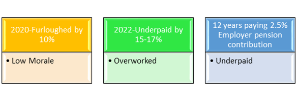 • The City of Santa Cruz furloughed our members countless times to balance their budget. The City’s 2022 compensation study members’ job classifications are under market by 15%.