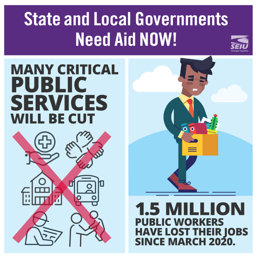 Senate Republicans are pushing for no aid for state and local governments and provisions that try to force schools to re-open even if it’s not safe. This is unacceptable! The “trigger cuts” we would see for public and non-profit services across California will be devastating if we don’t get more aid for state and local governments from Washington, DC. This means: