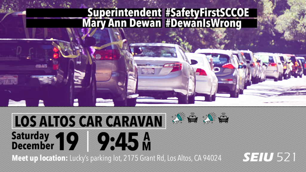 It’s important we have a great turnout at our car caravan this Saturday, December 19, 2020. Join us at 9:45 a.m. at Lucky’s parking lot, 2175 Grant Rd., Los Altos, CA 94024. RSVP NOW to Tammy.Dhanota@seiu521.org.